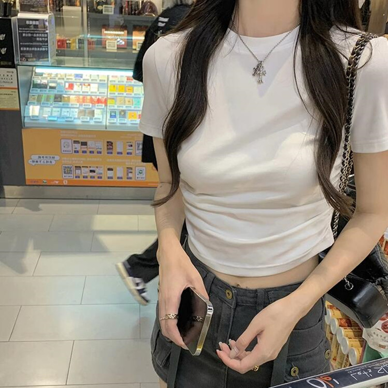 正肩白色t恤女短袖夏季新款修身紧身显瘦纯欲辣妹短款褶皱上衣服