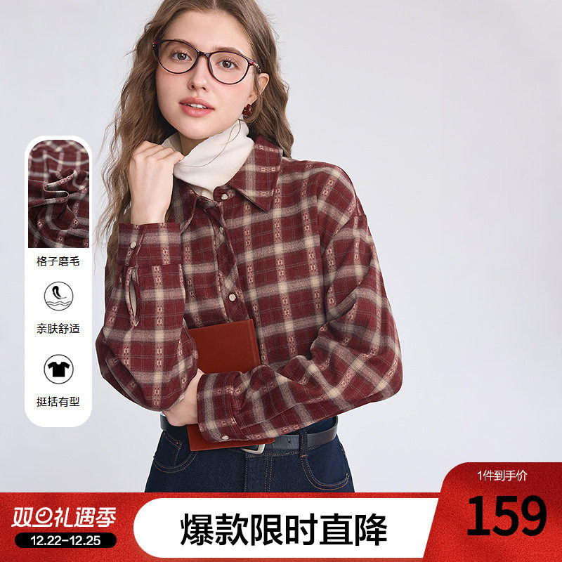 betu百图氛围感红色磨毛格子衬衫女2025年冬季新款洋气减龄衬衣