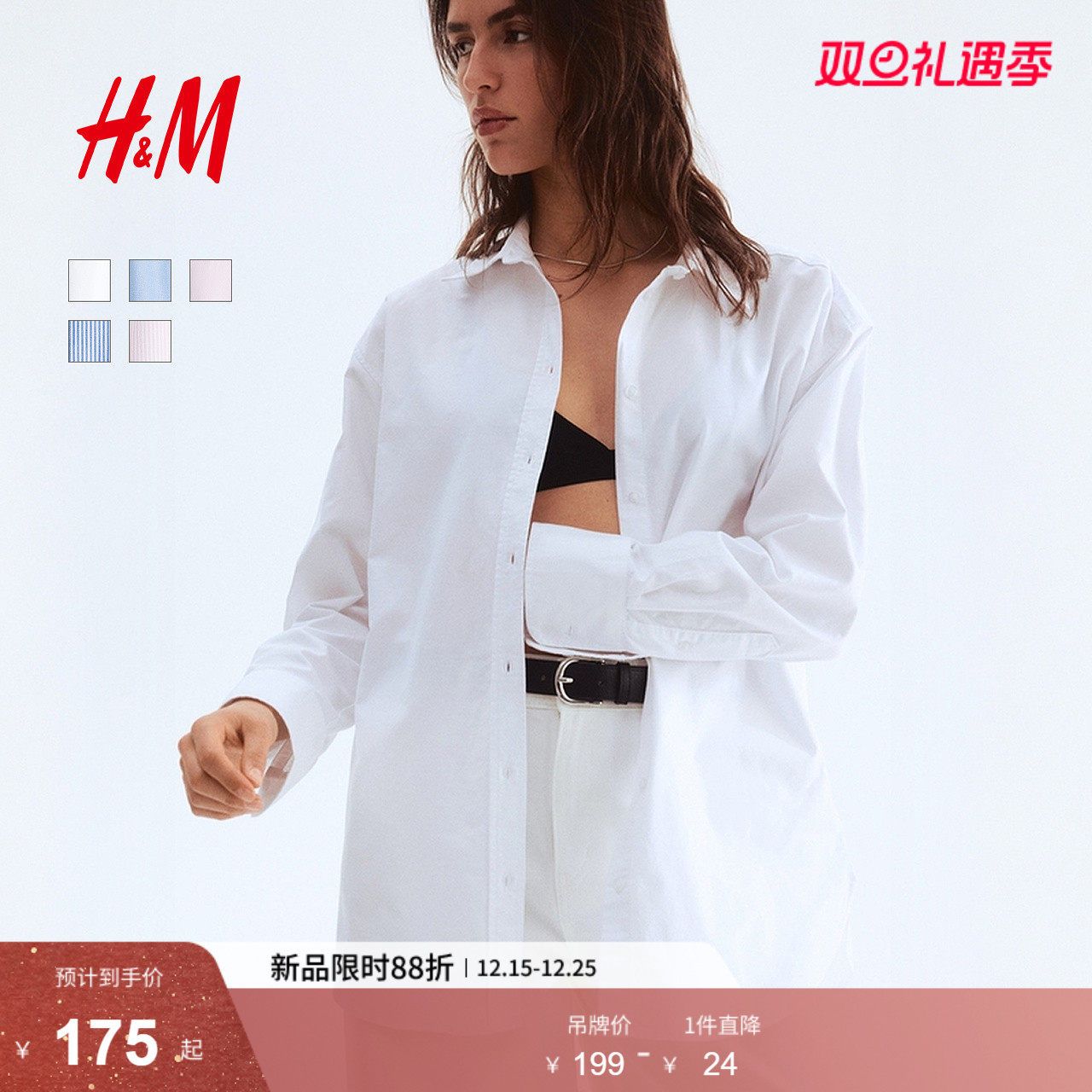 HM女装衬衫冬季打底衫法式宽松翻领牛津纺慵懒松弛感衬衣0925212