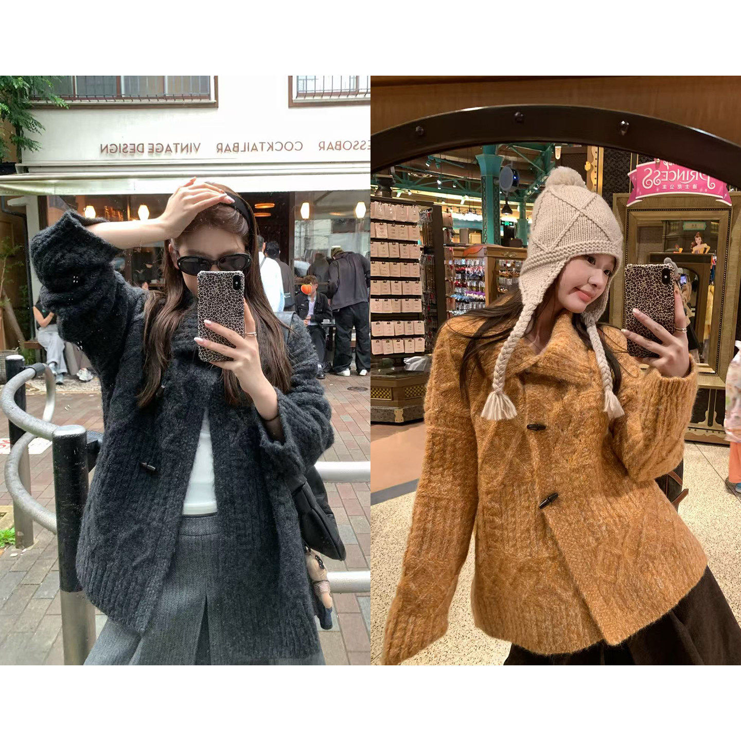 im向 重工绞花牛角扣翻领慵懒麻花毛线衣女秋冬外搭羊毛毛衣外套