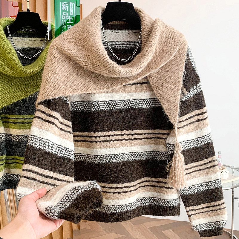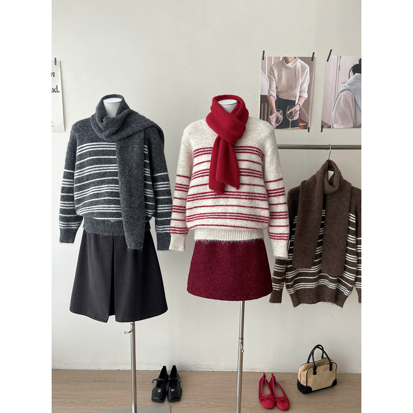 日韩系慵懒风复古新年条纹毛线衣女秋冬百搭配围巾针织衫两件套装