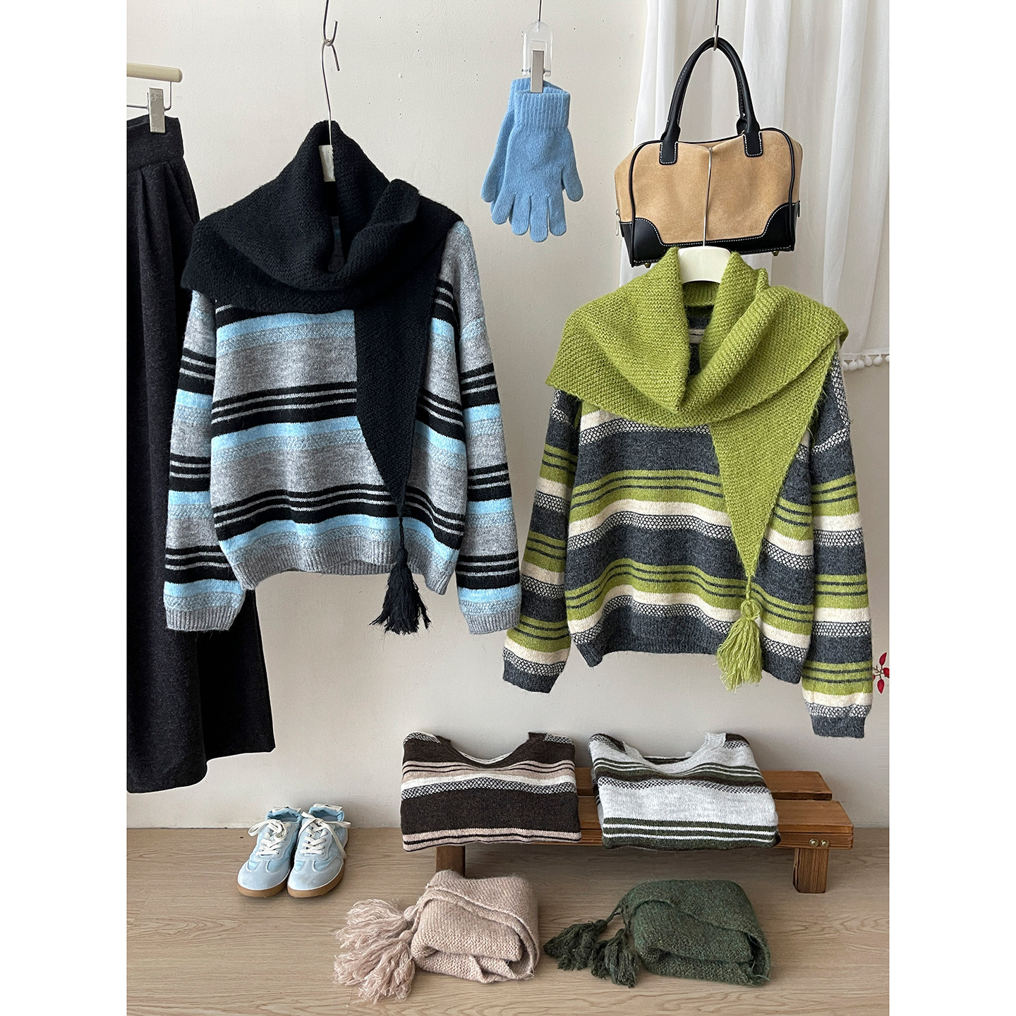 日韩系慵懒风复古条纹毛线衣女秋冬百搭配披肩围巾针织衫两件套装