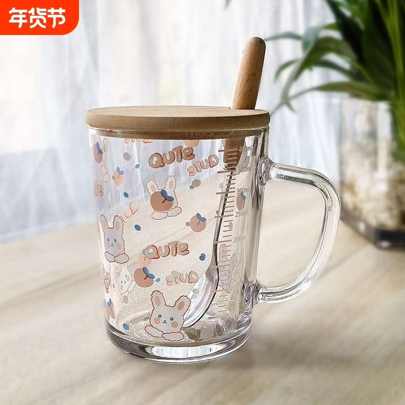 卡通玻璃吸管杯可爱牛奶杯早餐刻度杯带盖勺礼物便携水杯微波炉杯