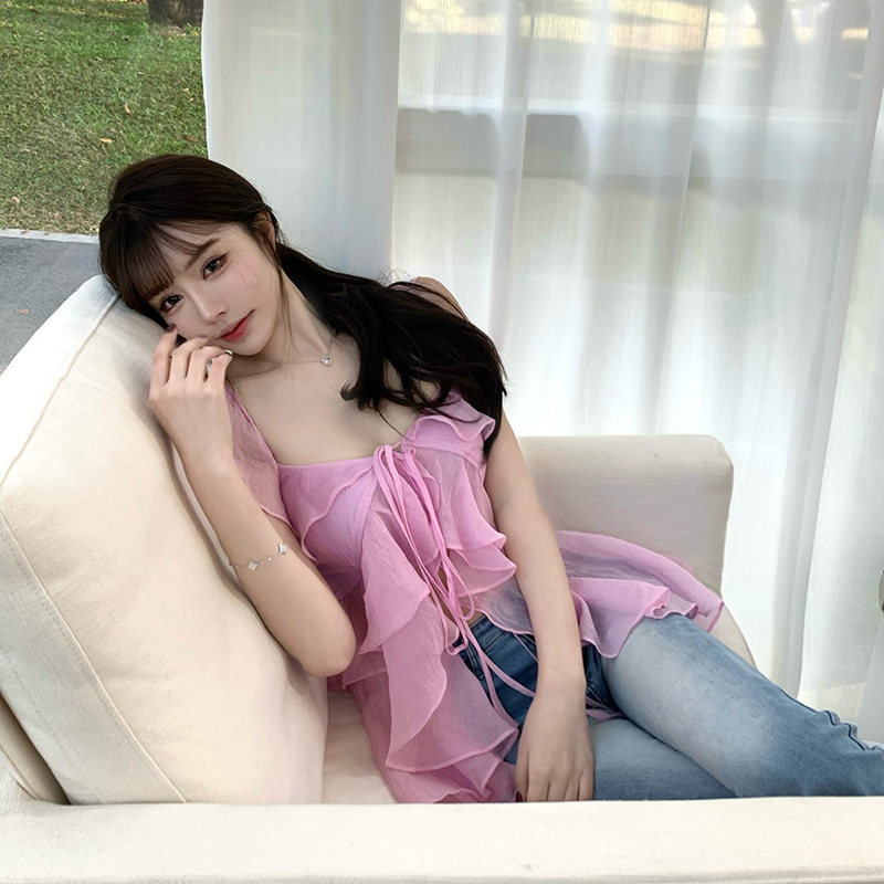 Liuu嘻嘻阿法式纯欲小飞袖超仙吊带女春季性感荷叶边绑带网纱上衣