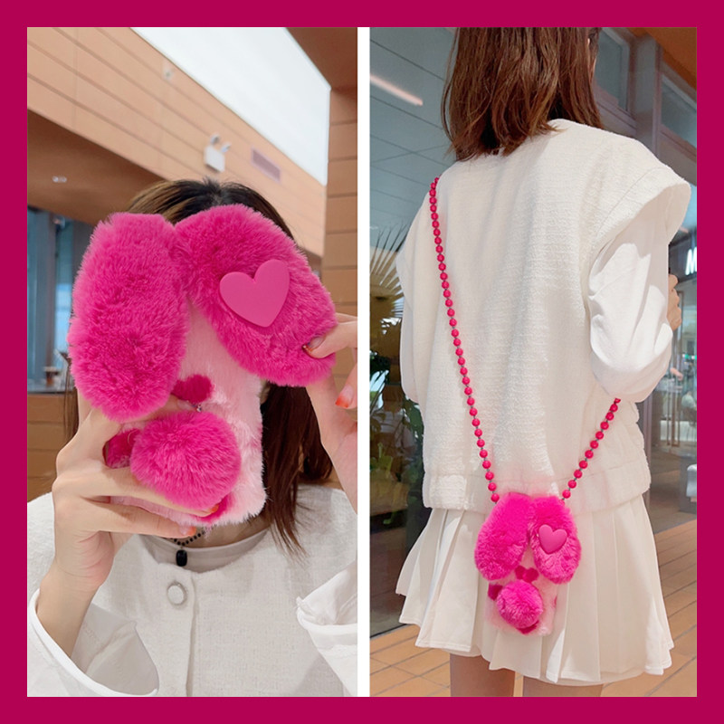 玫红爱心兔子耳朵适用苹果17air手机壳iphone16promax斜挎15plus毛绒14秋冬季13mini迷你12软11/xr8/7xsmax/6
