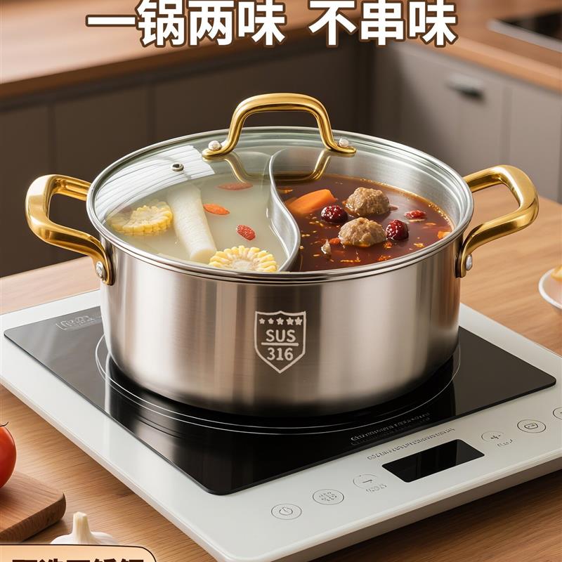 316不锈钢鸳鸯锅电磁炉专用鸳鸯火锅锅具家用火锅盆加厚一体成型