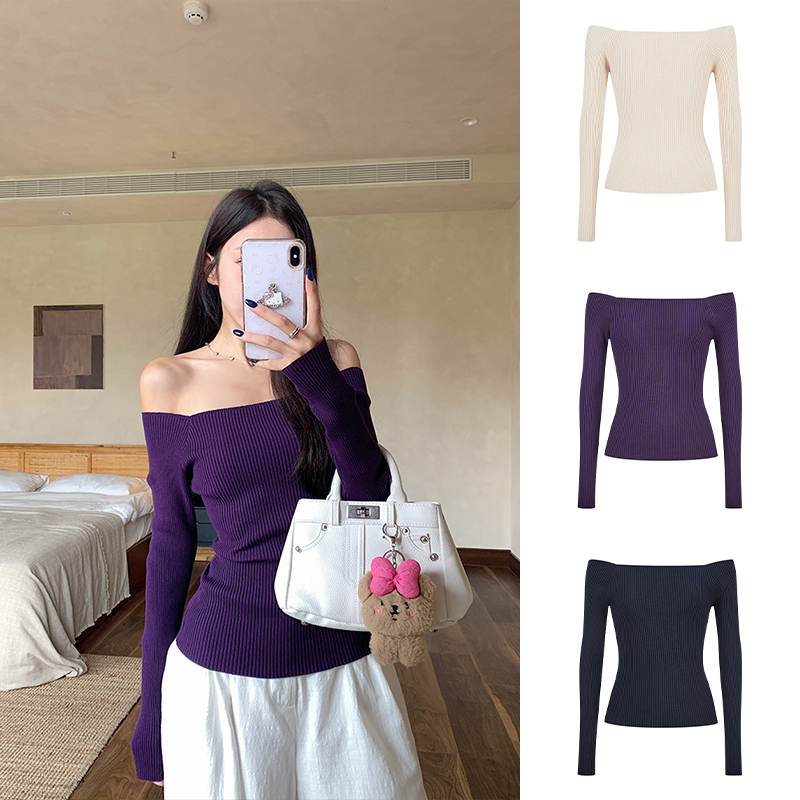 HHYB别来无恙 一字领露肩长袖针织上衣2024新款百搭显瘦上衣M577