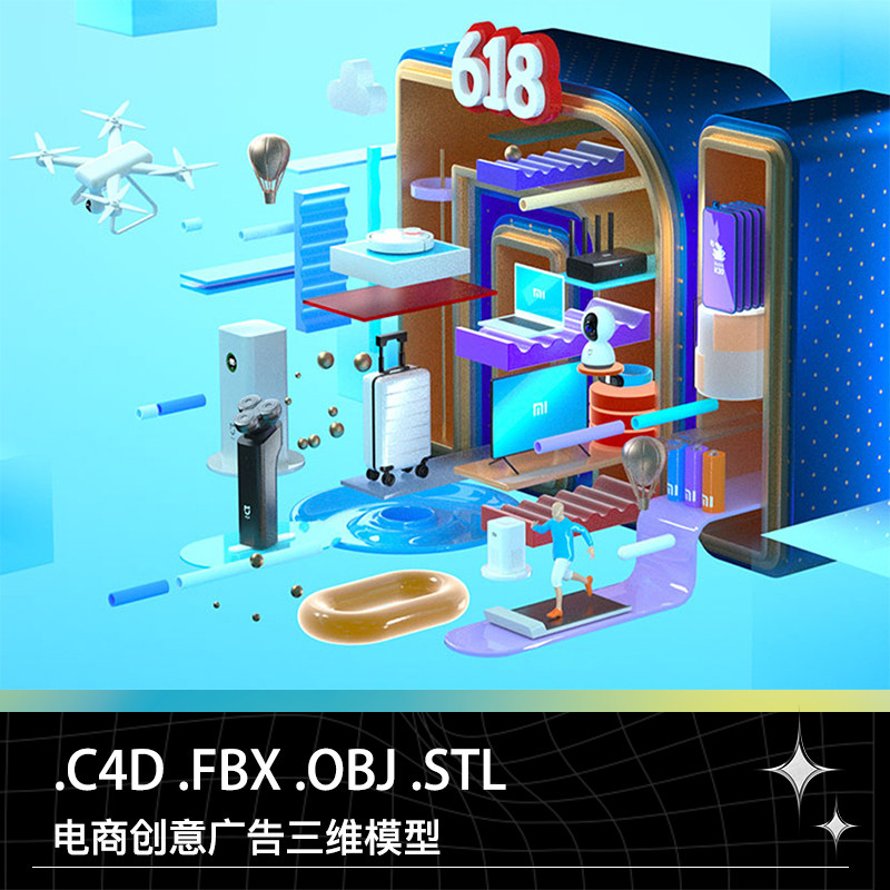 C4D FBX OBJ电商创意广告剃须刀无人机路由器拉杆箱电池模型素材