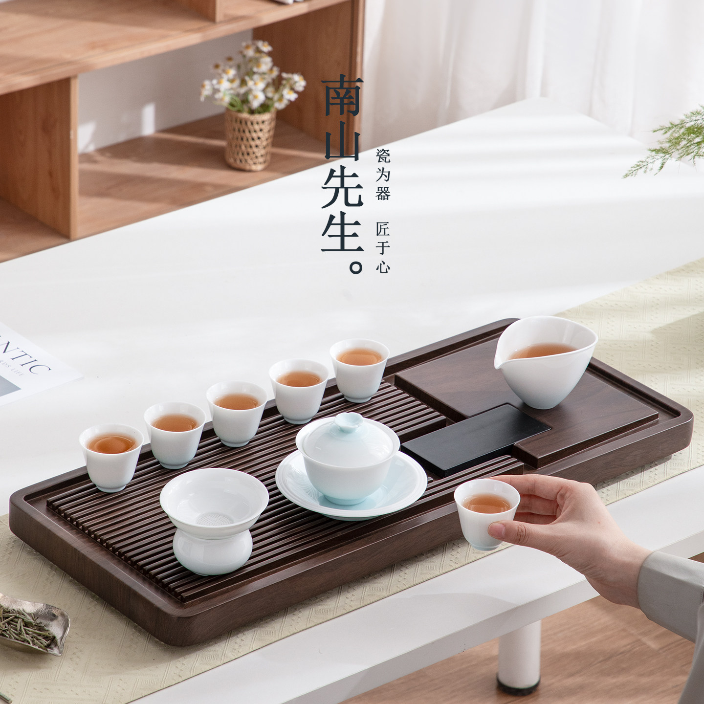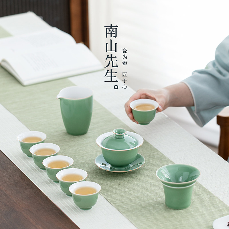 南山先生碧影盖碗九件套家用功夫茶具套装小套陶瓷泡茶具高档送礼