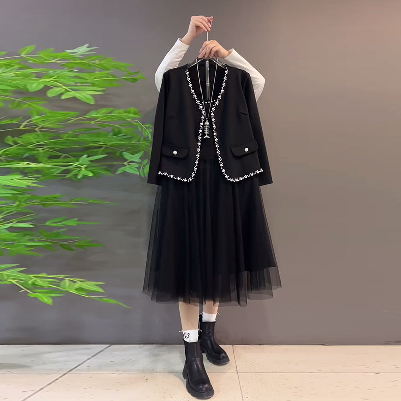大码女装V领钉珠边长袖外套网纱打底裙胖妹妹气质通勤显瘦两件套