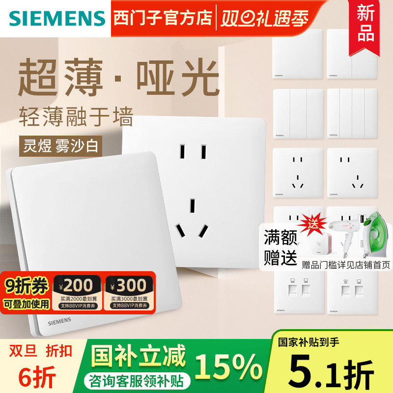 西门子开关插座面板超薄灵煜灵悦家用五孔带开关暗装白灰金色套餐