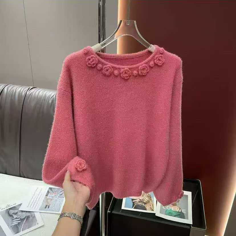 温柔手工钩花细闪亮丝针织衫立体花朵甜美减龄圆领宽松时尚上衣女