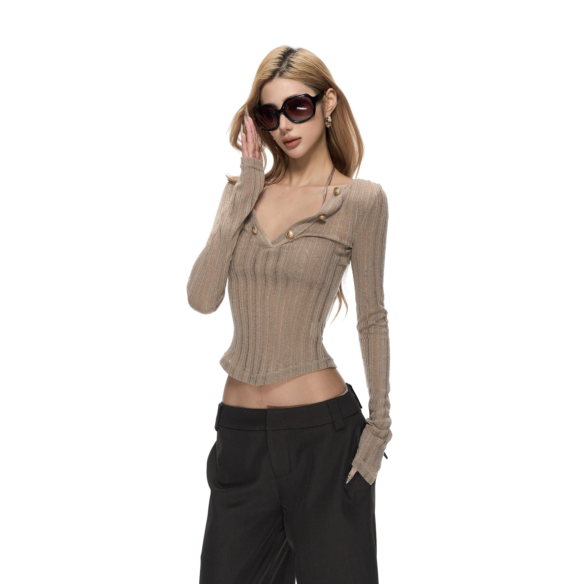 Fanptntox亮丝卡其色金属扣V领性感镂空坑条针织衫女弹力打底上衣
