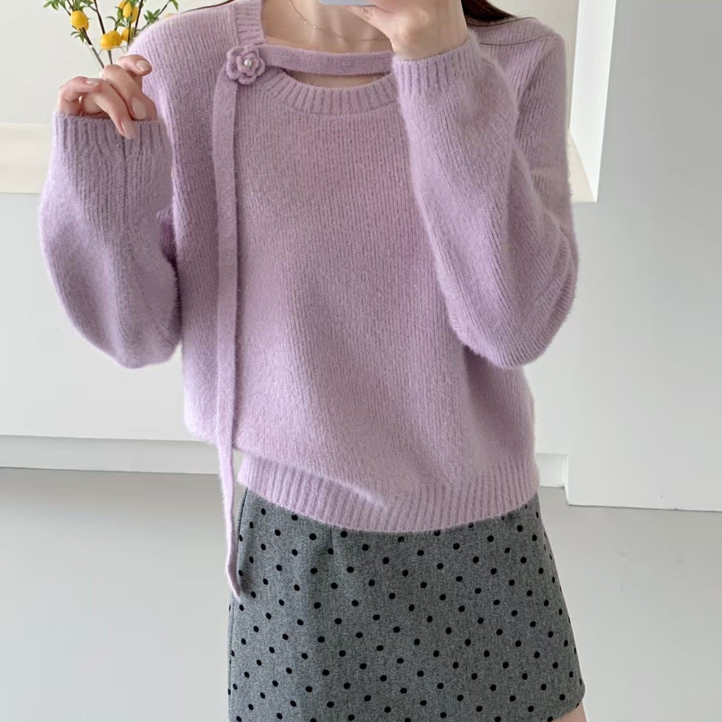 水貂绒飘带毛衣打底衫女2025年秋冬新款温柔风洋气减龄亮丝针织衫