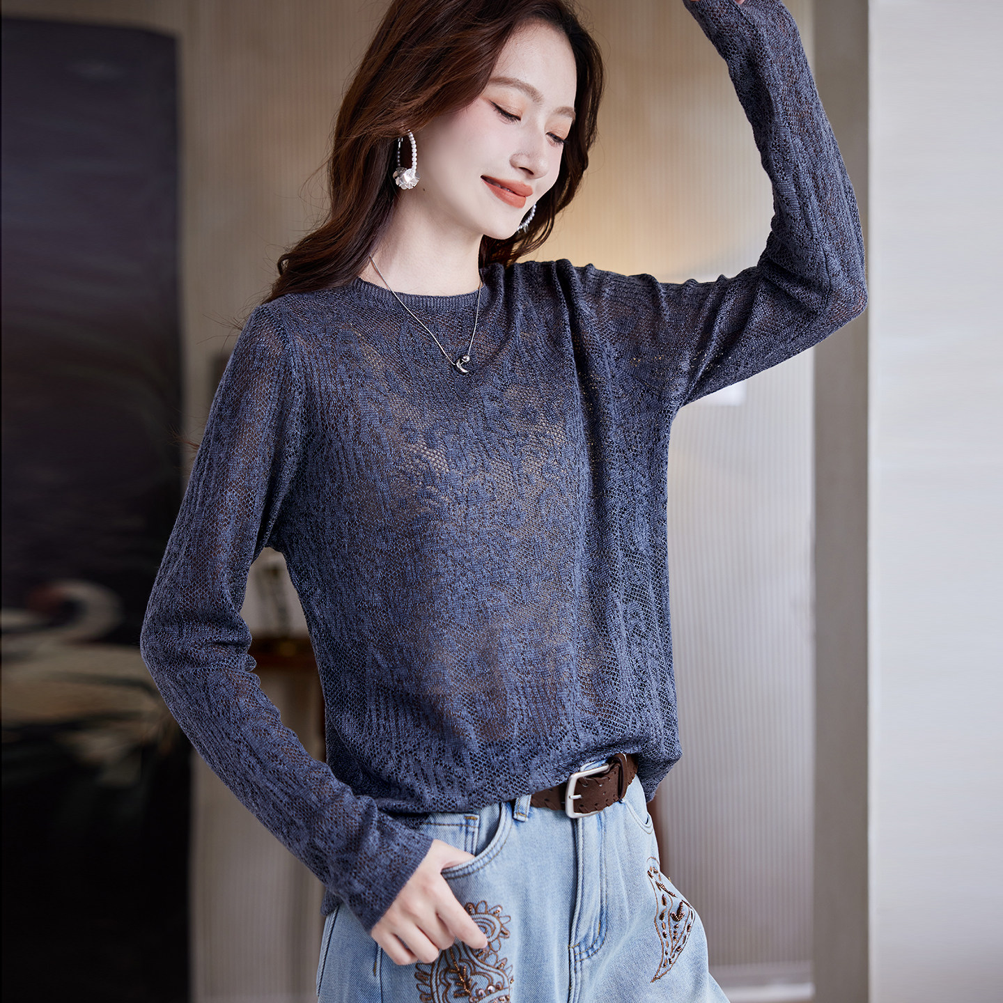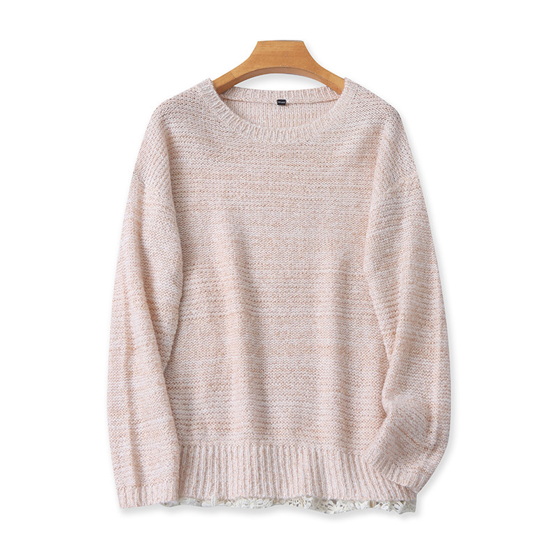 圆领蕾丝亮丝针织衫 春秋新款长袖显瘦T恤打底衫 女毛衣上衣20514