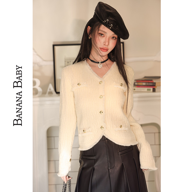 BANANA BABY2025年冬法式千金小香风亮丝针织衫女复古肌理感上衣