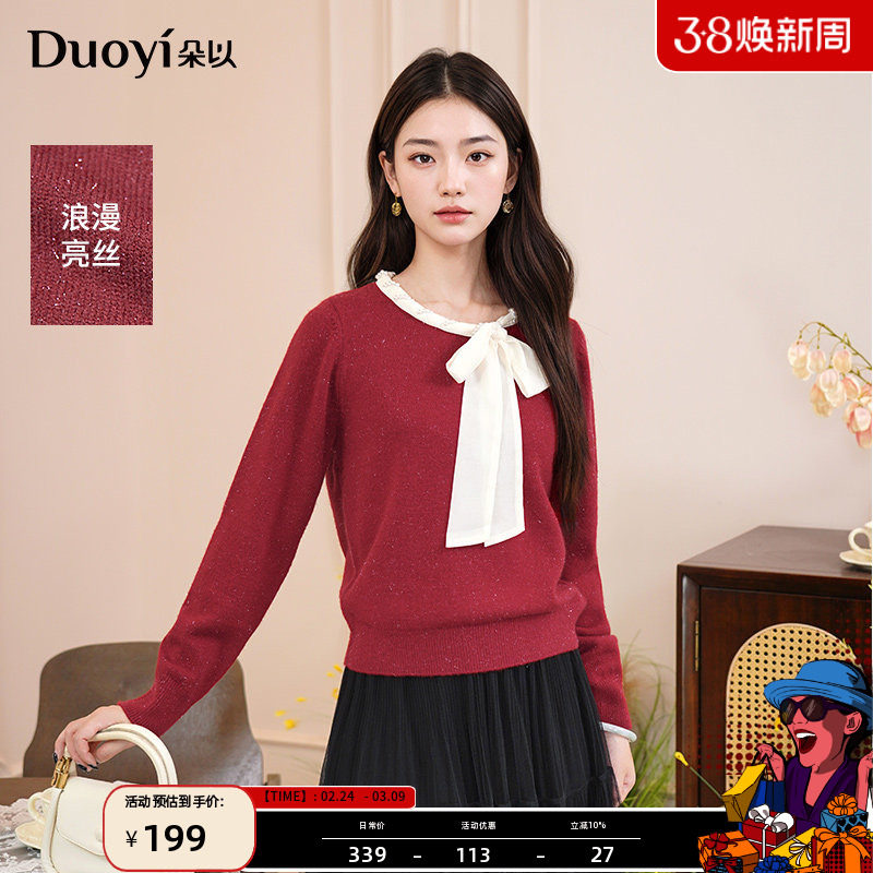 朵以2025冬季新款红色新年战袍珍珠系带蝴蝶结圆领毛衣亮丝针织衫