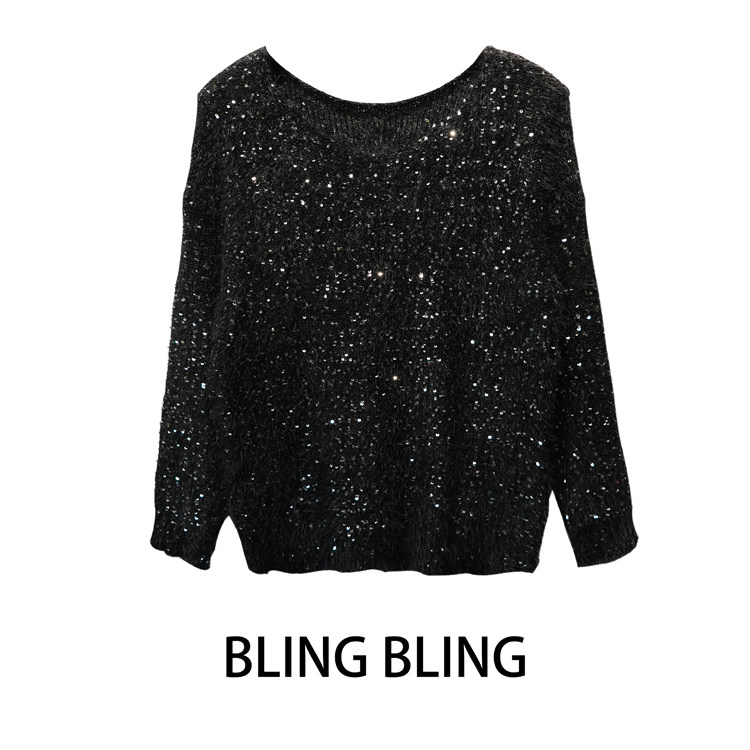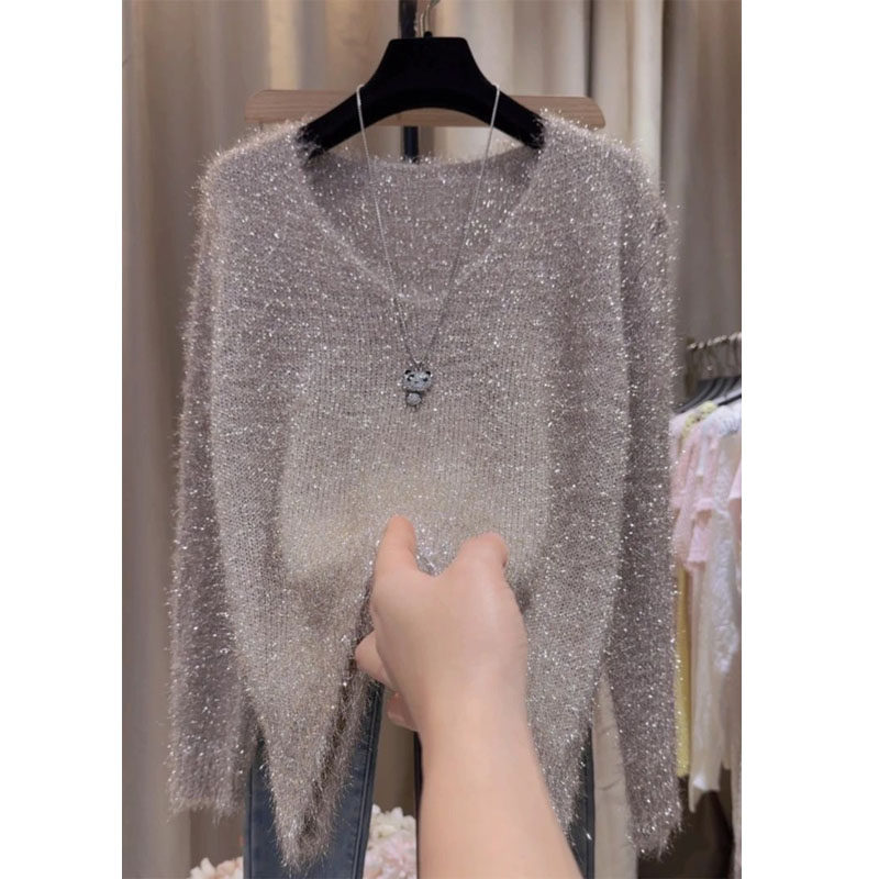 亮片v领毛衣女套头2025秋冬新款宽松慵懒风内搭上衣亮丝针织衫潮