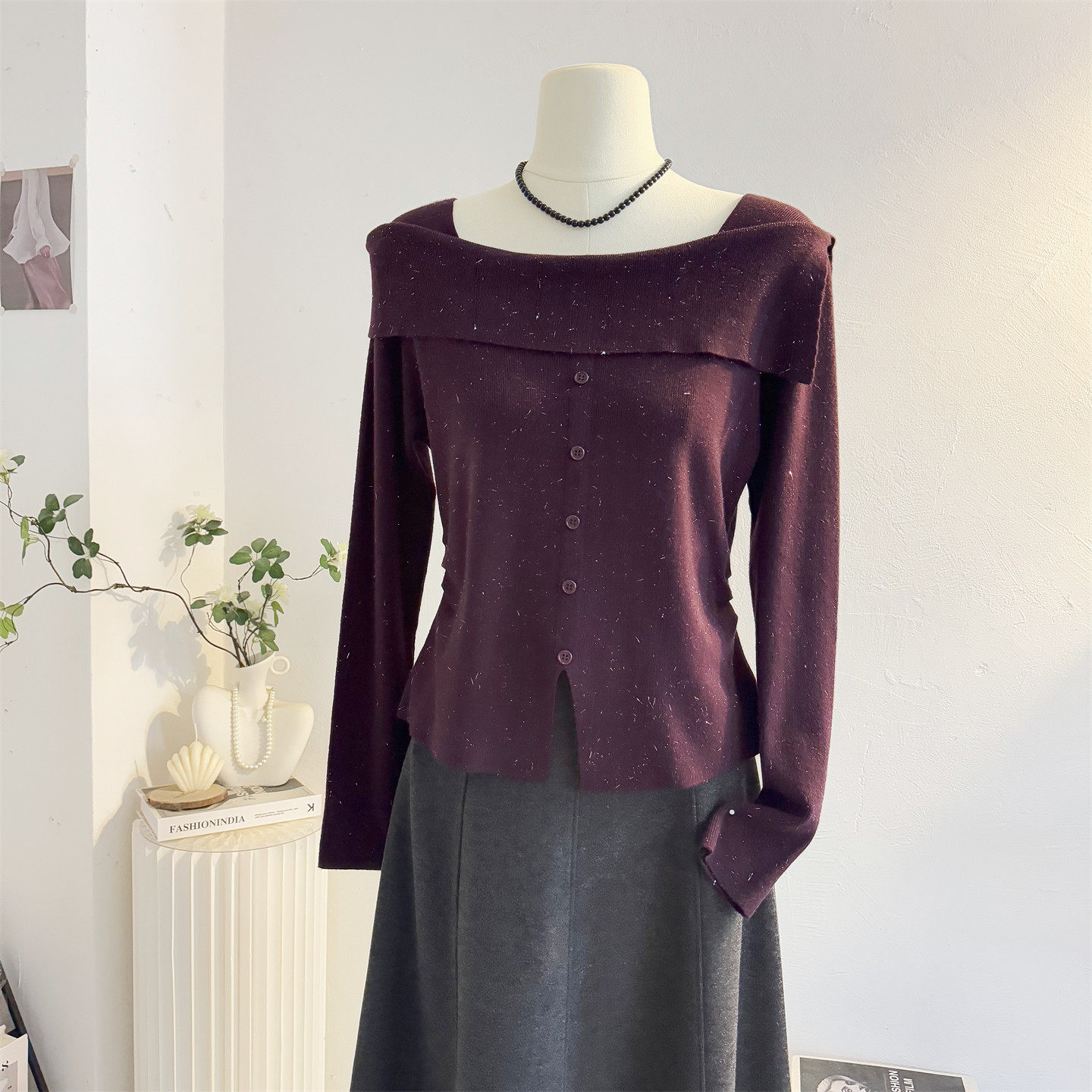 紫色法式方领亮丝针织衫女2025秋冬温柔风气质收腰内搭打底衫上衣