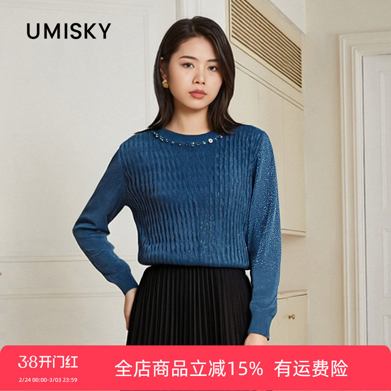 umisky优美世界冬季菱纹钉珠亮丝针织衫圆领毛衣NK4W1912