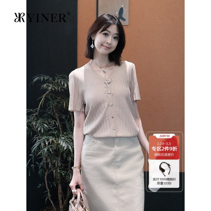 【新中式】YINER音儿2025秋季新款优雅V领盘扣亮丝针织衫轻上衣