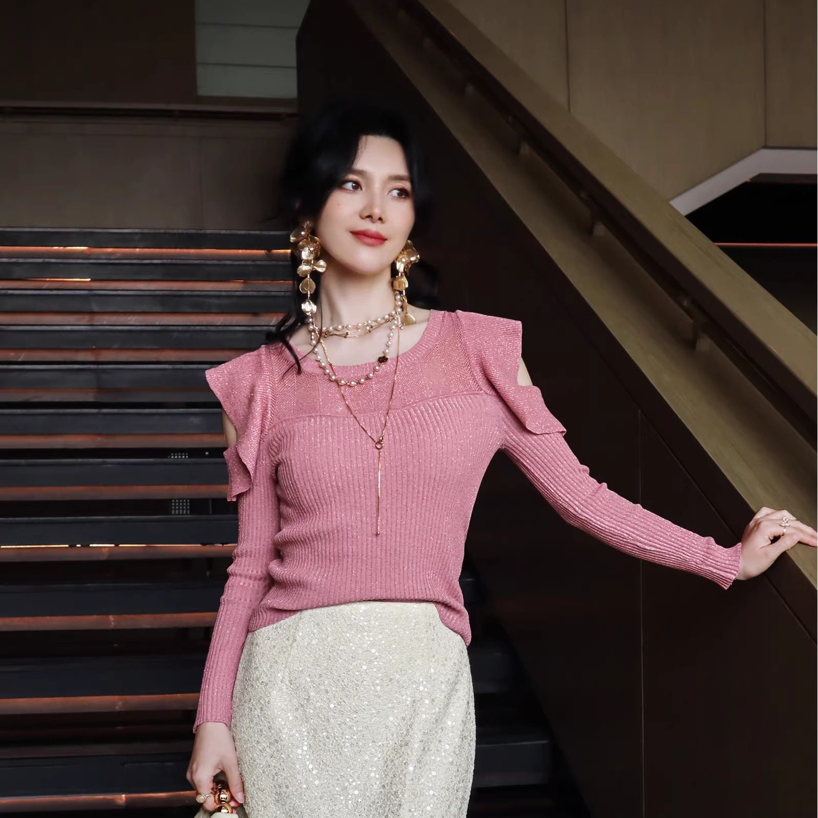 法式优雅气质设计感荷叶边小众露肩显瘦百搭温柔风亮丝针织衫上衣