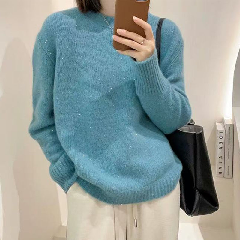 圆领亮闪羊绒毛衣女2025冬季法式宽松外穿亮丝针织衫羊毛打底上衣