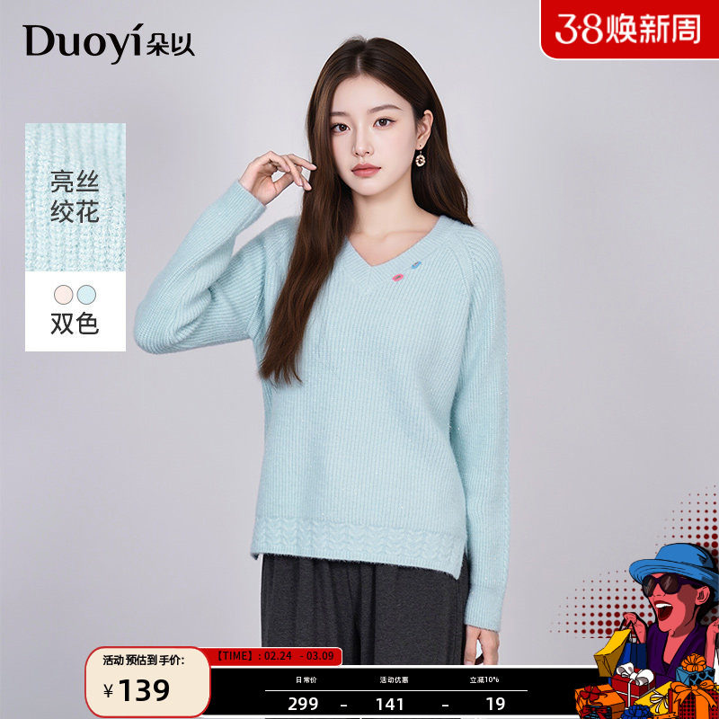 朵以2025冬季新款温柔慵懒风V领麻花毛衣开叉插肩袖亮丝针织衫
