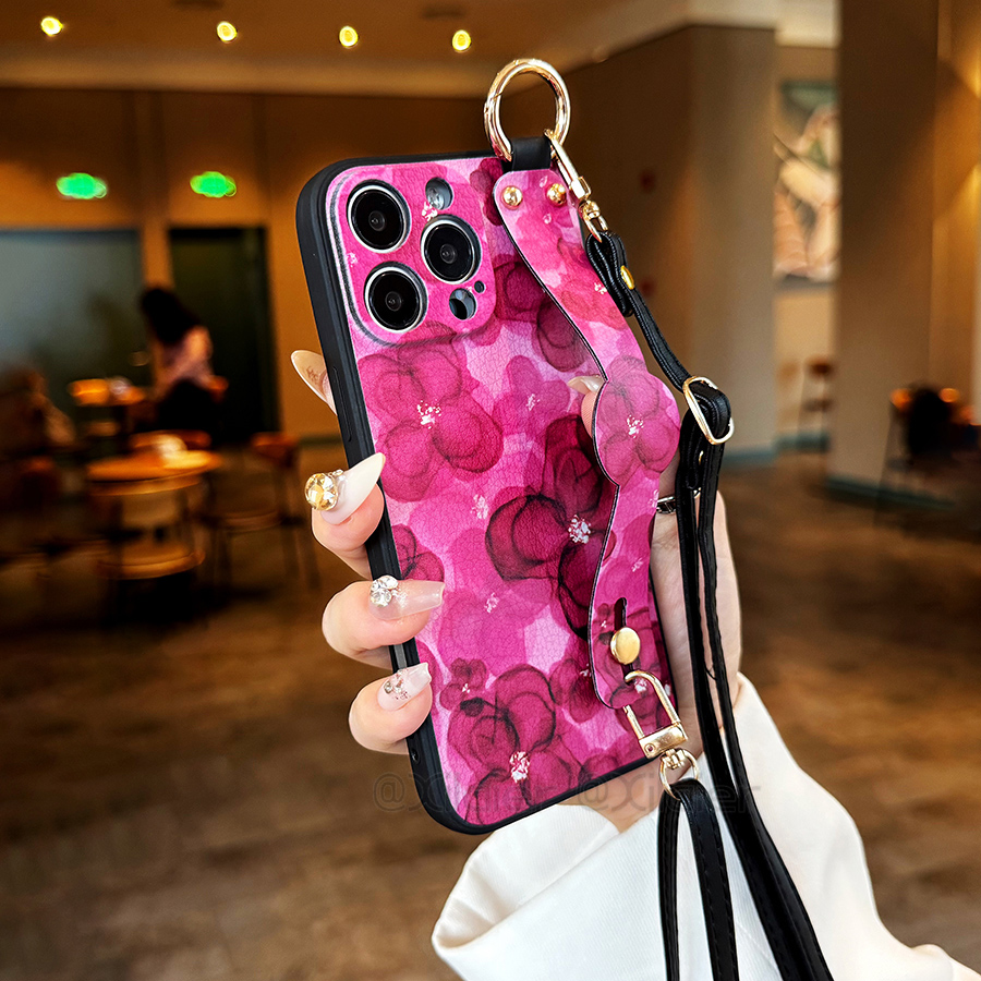 山茶花适用iPhone15苹果13手机壳16新款11女14带挂绳17斜挎背带promax防摔8plus腕带Pro硅胶12斜跨XR保护套XS