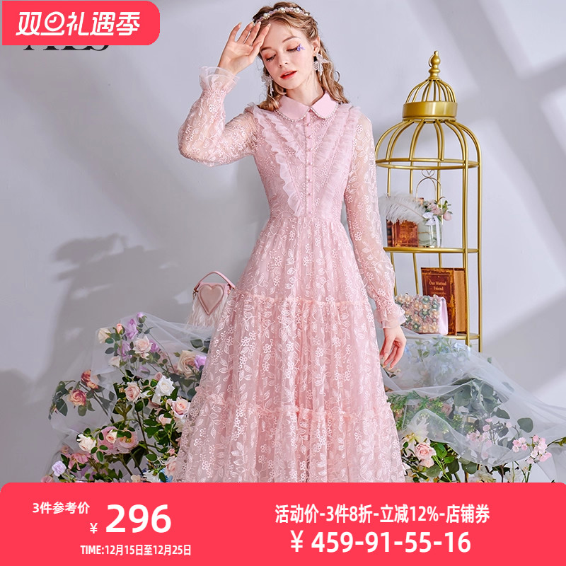 未风粉色蕾丝超好看连衣裙女秋冬2025新款女装高腰长袖裙子气质
