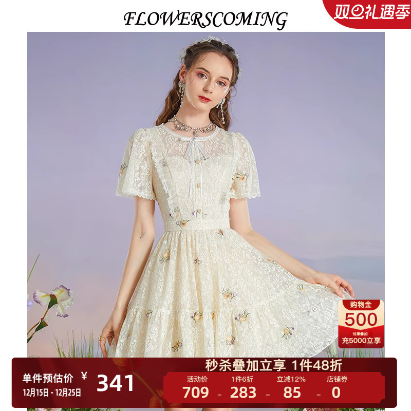 花儿开了2025夏季新款法式蕾丝刺绣连衣裙女高腰修身复古风蛋糕裙