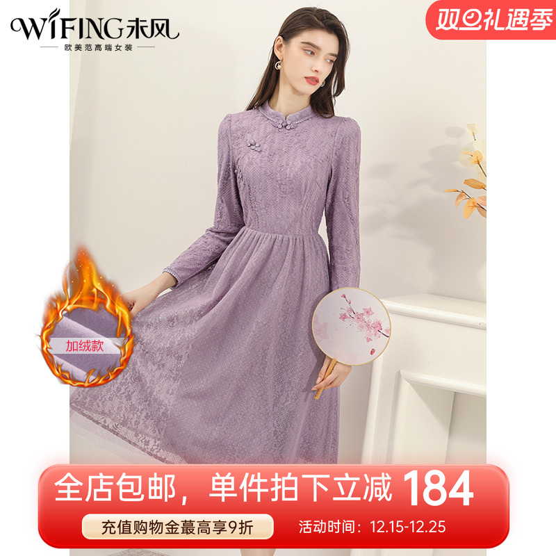 未风紫色新中式蕾丝连衣裙女冬2025冬季新款高腰打底内搭网纱裙子