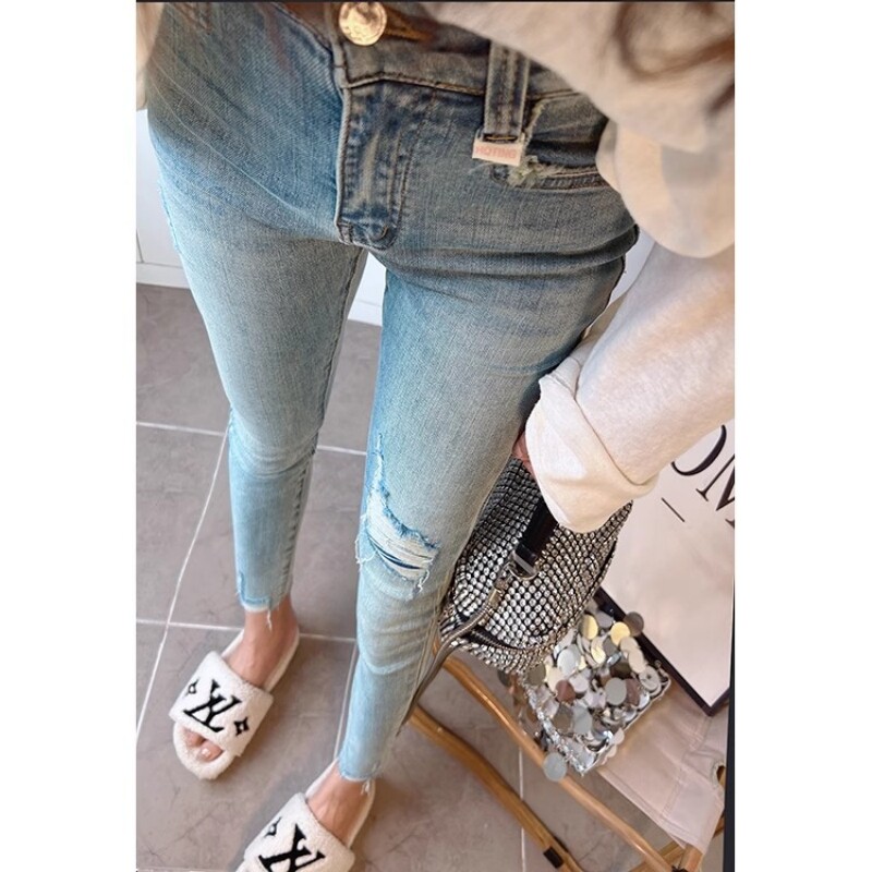 两粒扣高腰破洞牛仔裤女韩版新款弹力显瘦紧身小脚裤浅色九分秋季