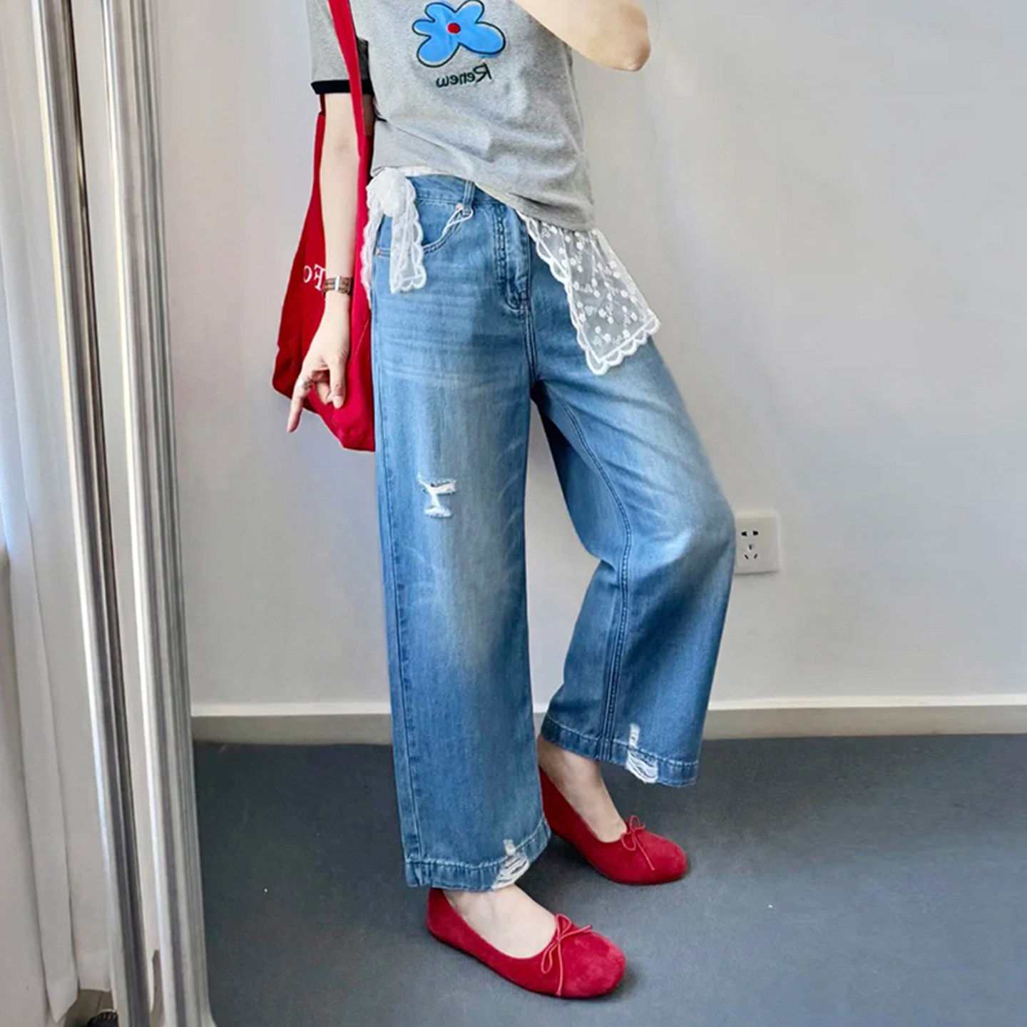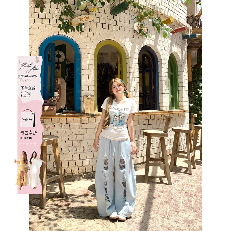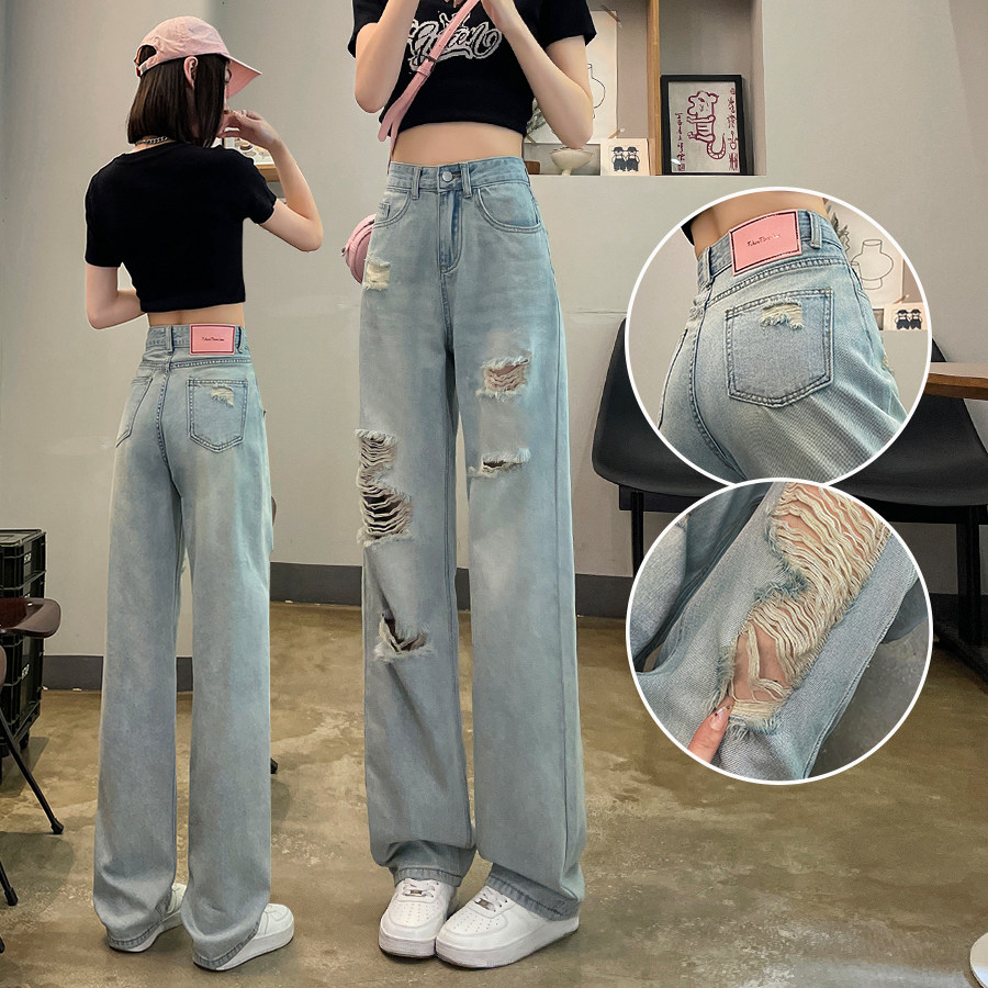 猫猫家加长女裤春夏薄款水洗破洞牛仔裤女轻高腰宽松浅色阔腿长裤