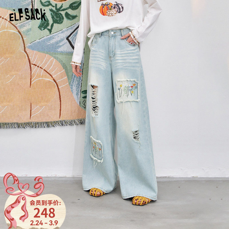 妖精的口袋浅色破洞刺绣阔腿牛仔裤女2026春夏款休闲高腰直筒裤子
