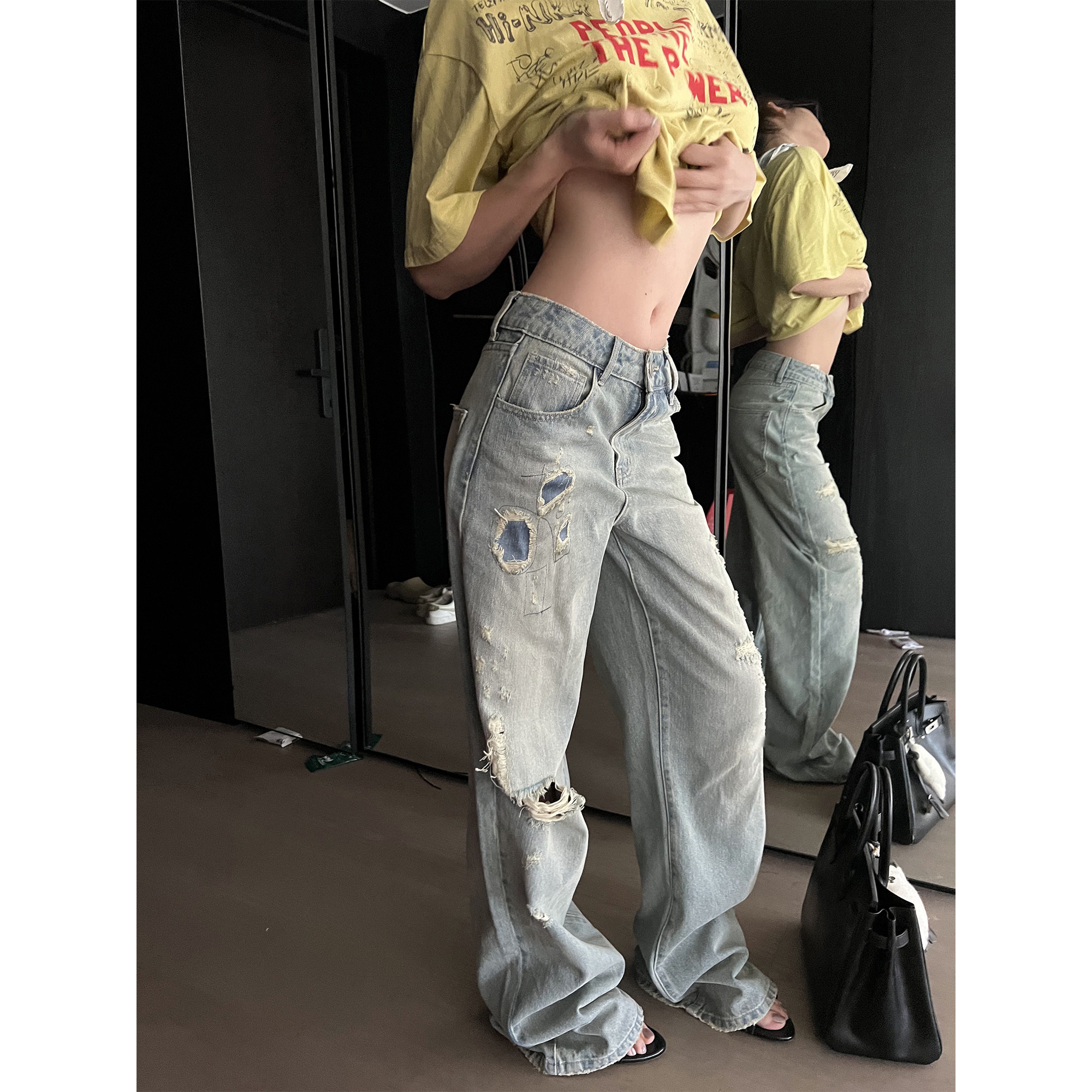 Xinlei Lin “辣妹blue”私物古着贴布浅色破洞牛仔裤女直筒裤
