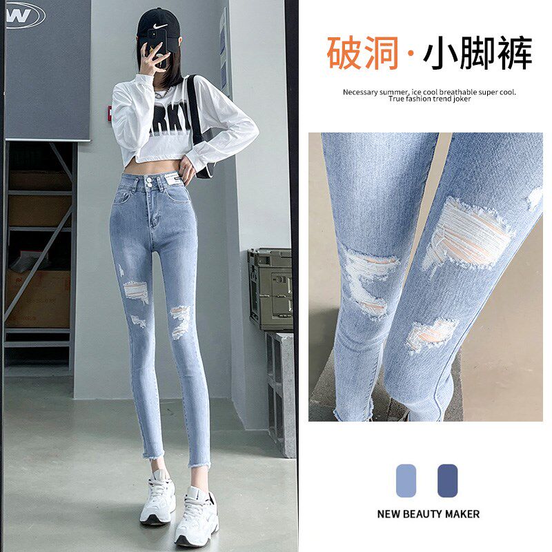 浅色破洞牛仔裤女春夏高腰紧身显瘦小脚裤弹力修身百搭九分铅笔裤