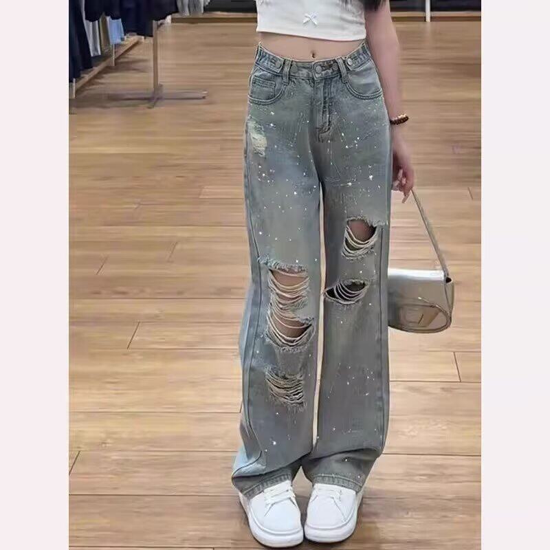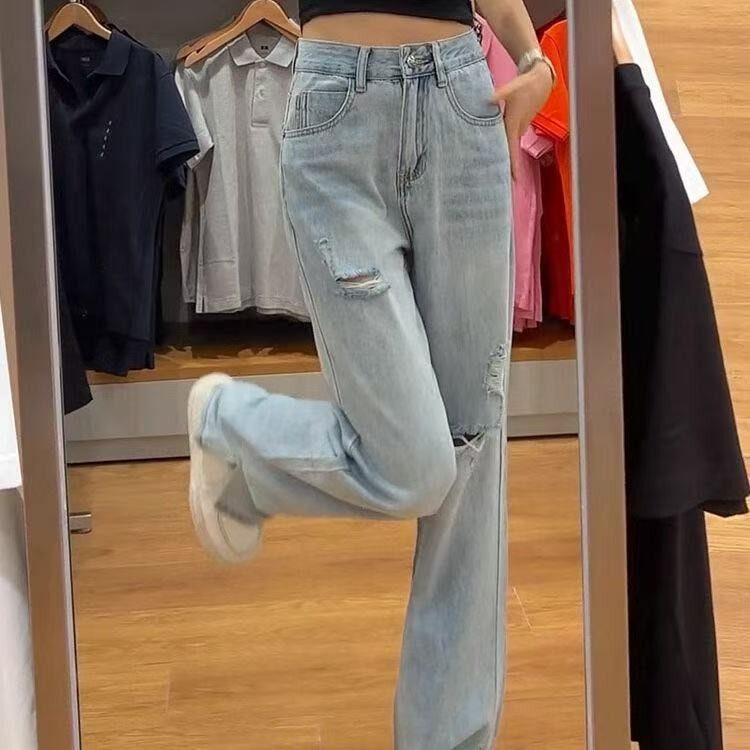 2025年春夏季新款美式显瘦破洞牛仔裤女阔腿大码浅色百搭直筒长裤