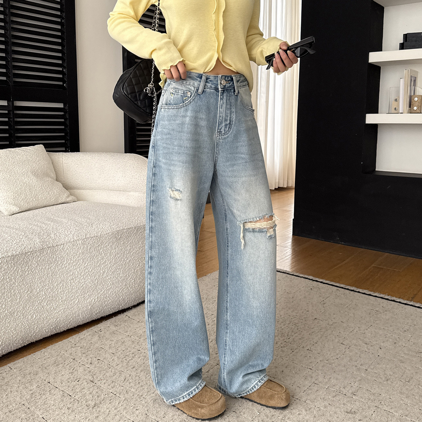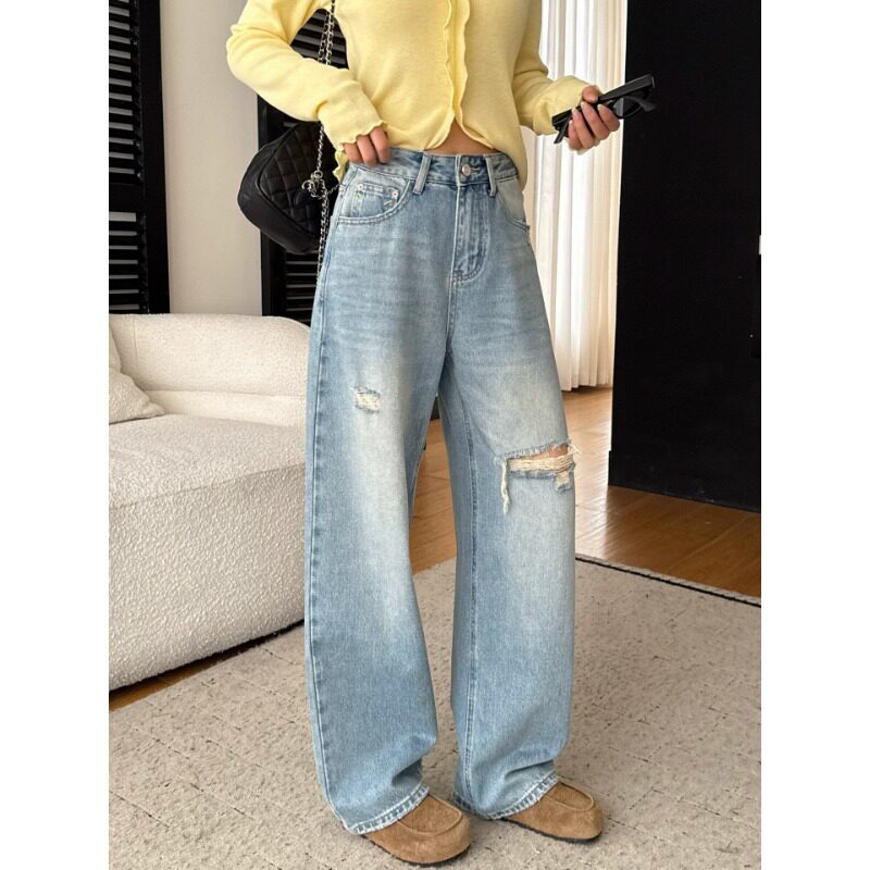 浅色破洞牛仔裤女春秋款2025新款冬季爆款高腰宽松直筒阔腿裤长裤