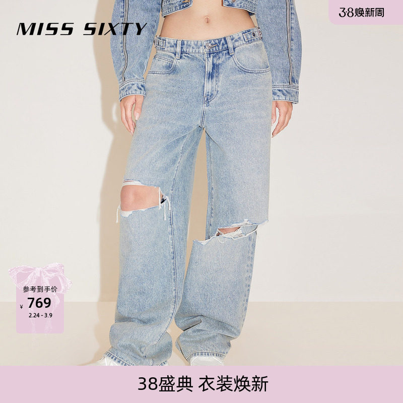 Miss Sixty春秋款浅色破洞牛仔裤复古显瘦女可调节高腰宽松直筒