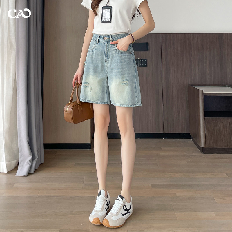牛仔短裤女2026夏新款浅色高腰宽松破洞水洗a字直筒五分阔腿中裤