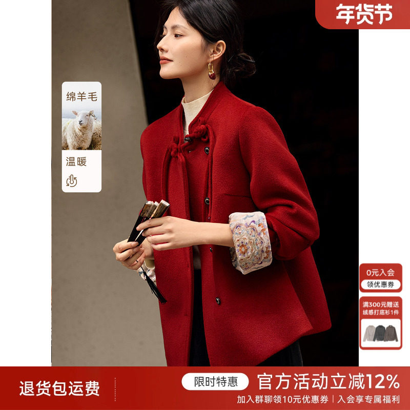 XWI欣未新中式红色盘扣大衣女秋冬丝绒拼接端庄大气国风毛呢外套