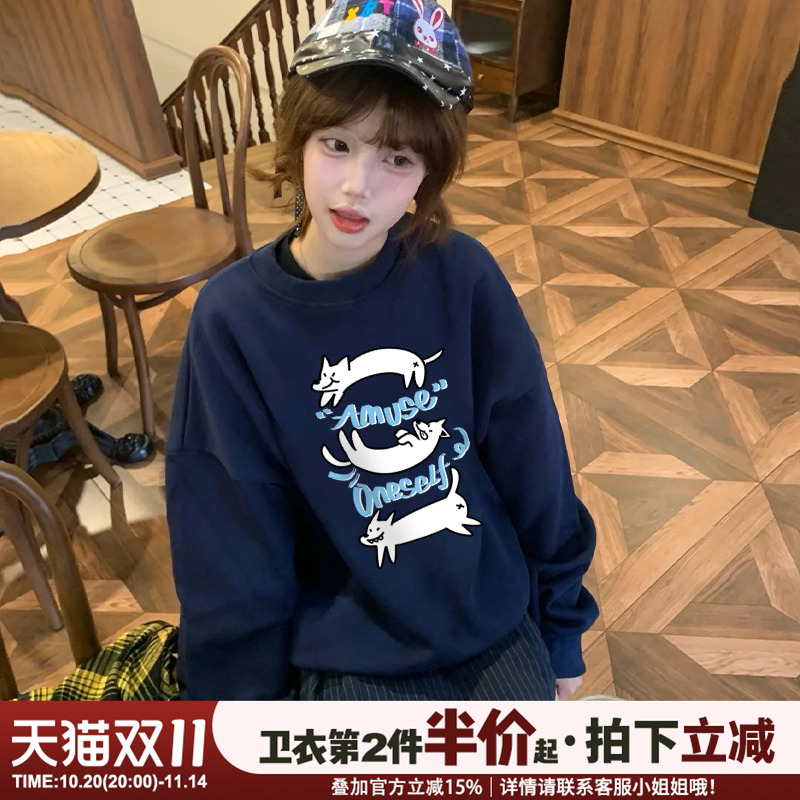 ulzzang小众学院风藏蓝色卫衣女设计感卡通狗狗印花宽松通勤上衣