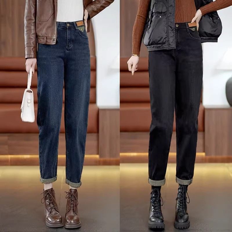 大码高腰牛仔裤女秋冬加绒胖妹妹mm显瘦直筒萝卜裤梨型身材哈伦裤