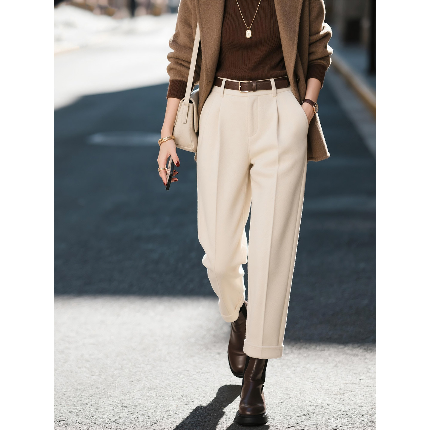 米白色毛呢哈伦萝卜裤女2026年秋冬新款高腰显瘦小个子九分烟管裤