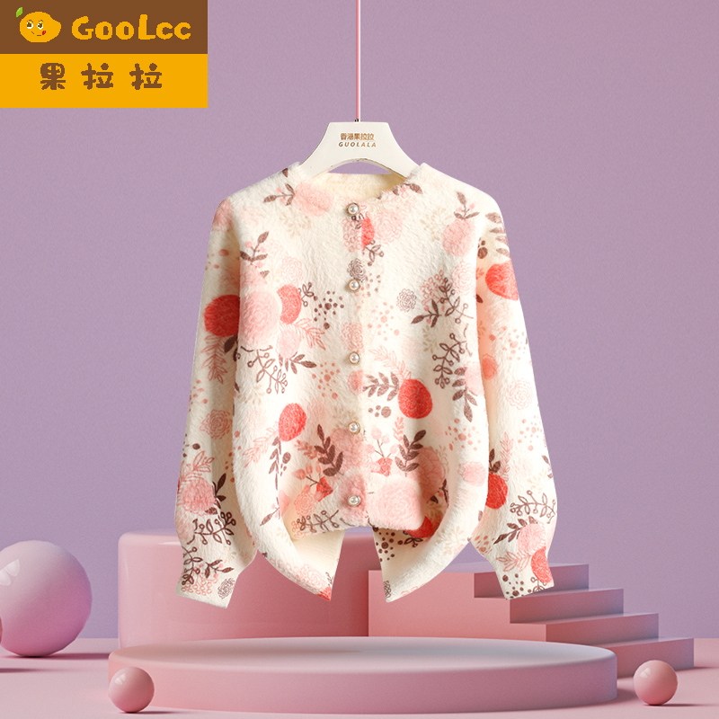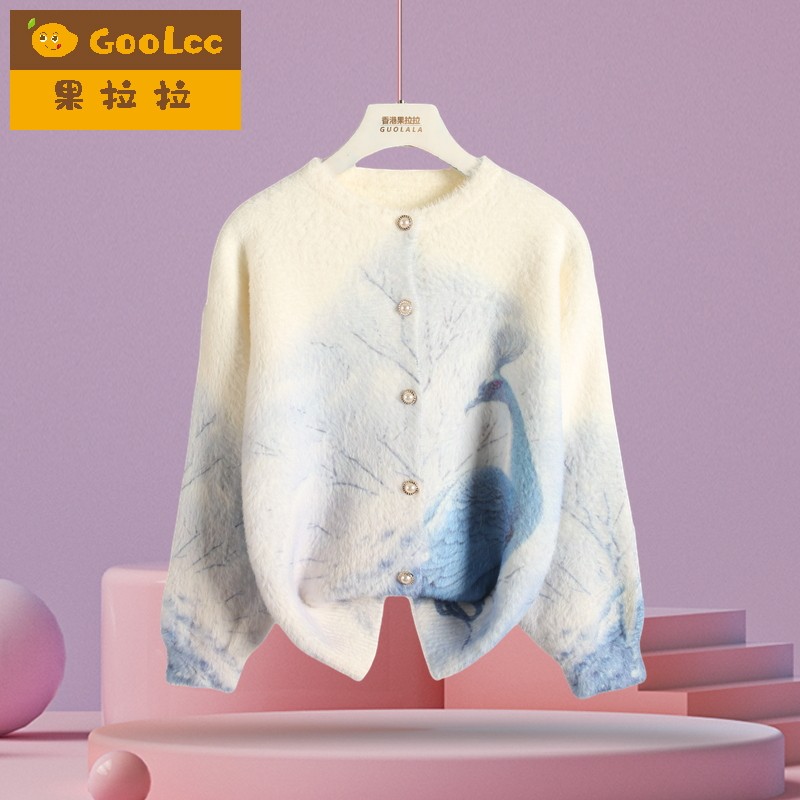 2025秋冬款中大童彩绘水貂绒开衫女童毛衣保暖外套宝宝上衣童装潮