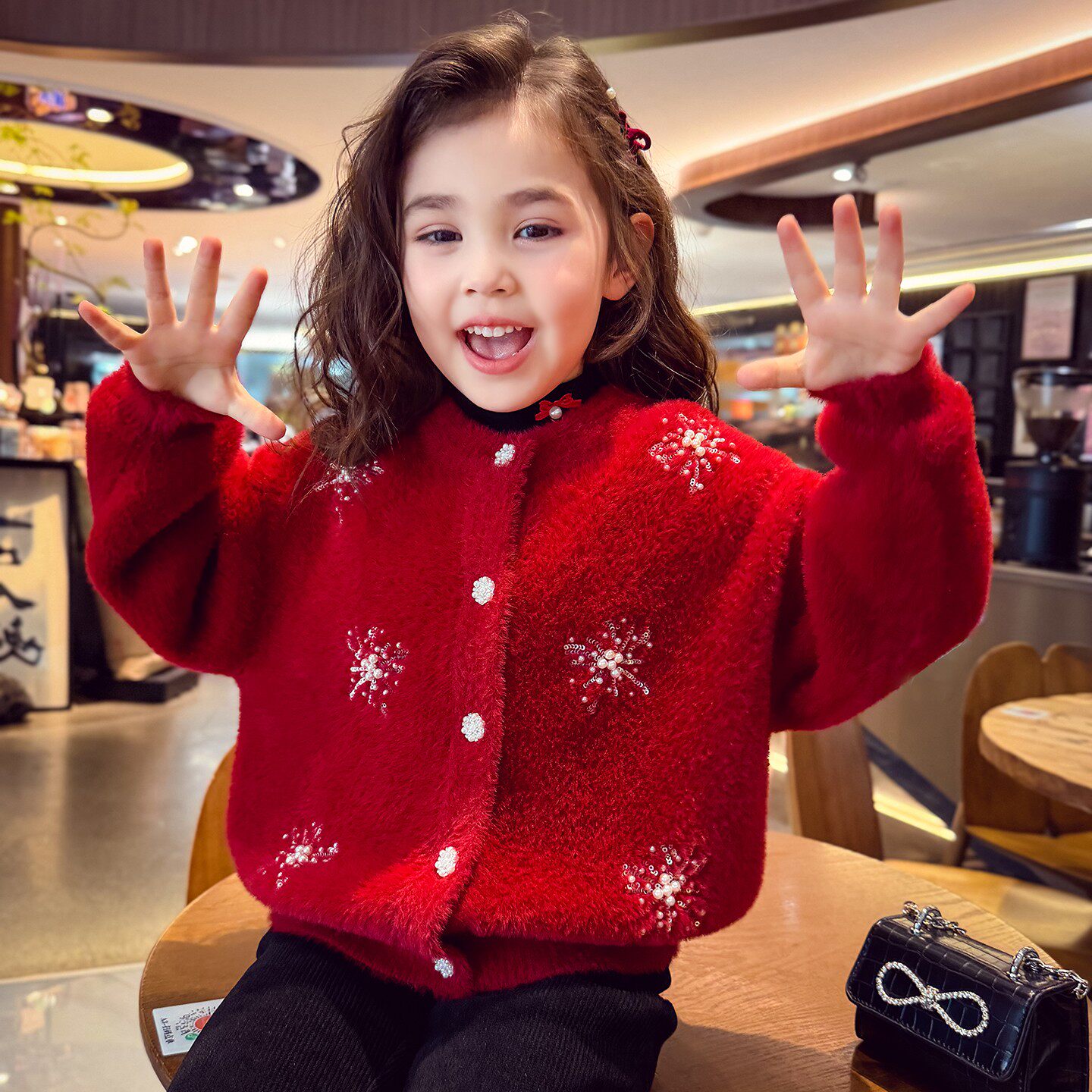 女童毛衣外套冬装2025新款儿童韩版红色新年亮片仿水貂绒开衫女孩