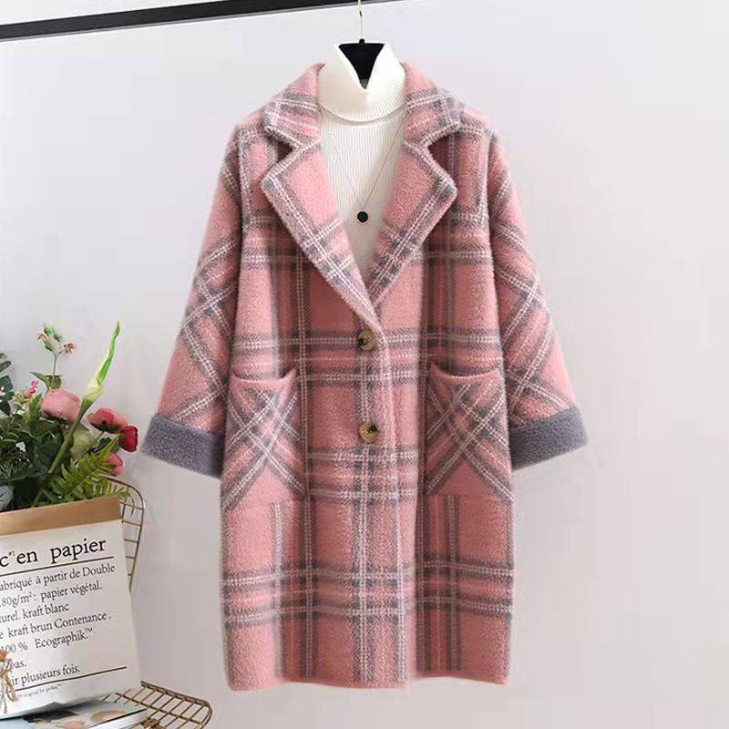 秋冬新款中长款仿水貂绒开衫女外套韩版大码宽松百搭加厚格子大衣