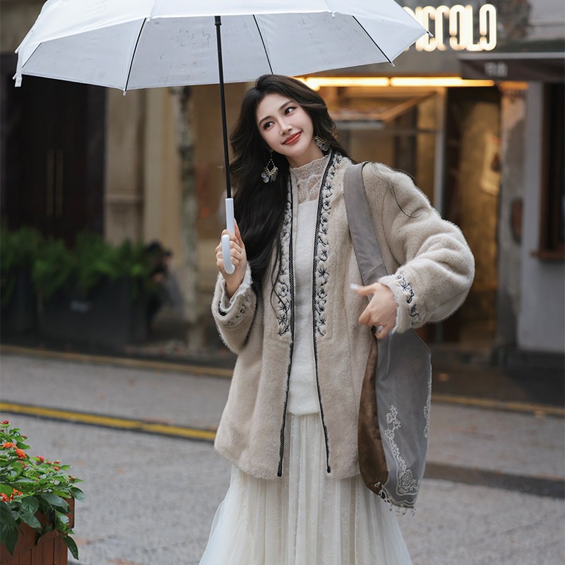 AZure复古环保皮草外套门襟刺绣设计轻奢毛绒大衣仿水貂绒开衫女