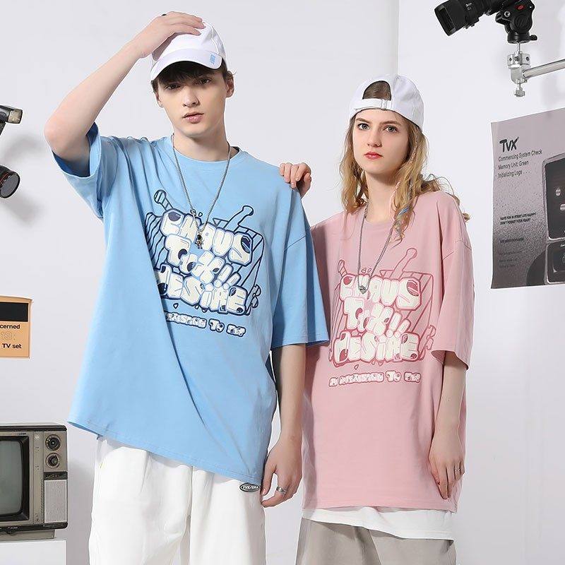 TVX夏季漫画感字母印花宽松落肩纯棉小抹布短袖五分袖T恤男女同款